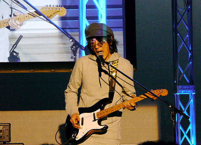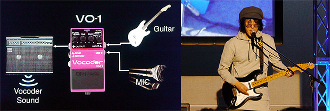 ▲ギターとマイクを接続するだけでボコーダー・サウンドが楽しめるVO-1(左)。そのサウンドを披露したのは、バービーボーイズでデビュー、現在は椎名純平らと結成したヒトサライなどで活躍中のいまみちともたか。最初に歌われたのはバービーボーイズの「チャンス到来」だった。