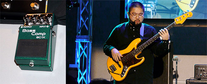 デモ演奏はZAZEN BOYSのベーシスト吉田一郎。昨年発表の「BB-1X」との組み合わせで、ナチュラルでありながら芯のあるコンプレッション・サウンド、スレッショルドとリリースを強めにセッティングしたアグレッシブなサウンドを聴かせた。「コンプをかけ忘れたのかな? と思うくらいファンダメンタル、基音、音の芯がまったく損なわれない」「踏み忘れたかな? と下を向くとちゃんとかかってる」とインジケーターの有用性に触れ、ベテラン、玄人と呼ばれる人から「コンプって何?」というエントリーユーザーまで「どなたにもオススメできるペダル」と評した。