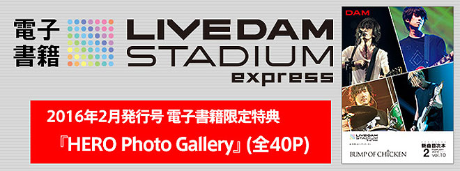 電子書籍「LIVE DAM STADIUM express」2月号にはこのほか、表紙にも登場しているBUMP OF CHICKENのインタビュー&撮りおろし写真を掲載。WHITE JAM、ソナーポケット、Little Glee Monster、三山ひろしのインタビューも読むことができる。価格は800円(税別)で、2月12日より発売(書店により販売開始日が異なる場合がある)。内容の詳細、販売電子書店は下記リンクでチェックを。