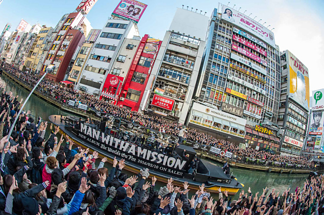 MAN WITH A MISSIONが2月11日に大阪・道頓堀リバーウォークでスペシャルフリーライブを行ない、現地に集結した約1万人を沸かせた。