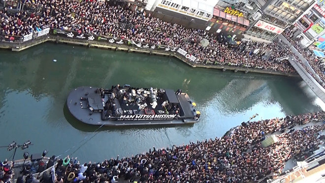 船に乗って現れたオオカミ達に怒号のような歓声が湧き上がり、彼らの大人気曲である「FLY AGAIN」をいきなり披露すると道頓堀はまるでライブハウスと化した。立て続けにニューアルバムに収録の「Dive」を披露。ジャン・ケン・ジョニーの「皆様ノ大好キナ道頓堀ヲ、ジャックシテシマイ陳謝致シマス!」というMCでも大いに盛り上がりをみせた。