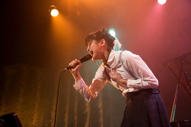 「せーの!」という大きな声に続いて、さらにテンポを上げて「FRIDAY」「よるのさんぽ」へ。まるで転がるようなスピードに乗せて手拍子が鳴り響く。軽やかに感情豊かに歌い上げると、跳ねるようなリズムの「ハイリゲンシュタットの遺書」、続く「アリス」では時に淡々と、「ペースト」では揺るがない強さを感じさせる歌声で観客を魅了した。