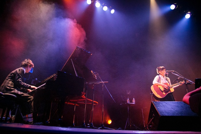 短いMCを挟み、ライブでの演奏が稀な「流れ星」でより深く痕跡を残したかと思うと、「1・2・3・4!」の掛け声とともに、アコギとピアノが絡み付く様に交わる「スメル」へ。そして音と音が突き放すようにぶつかる「心と体」で会場の空気を一変させた。ベース、ドラムのいないステージ。ピアノとアコギのみでうねるようなリズムとダイナミクスを生み出す二人に激しく感情が揺さぶられ、客席も息をのんでその姿に見入っているようだった。