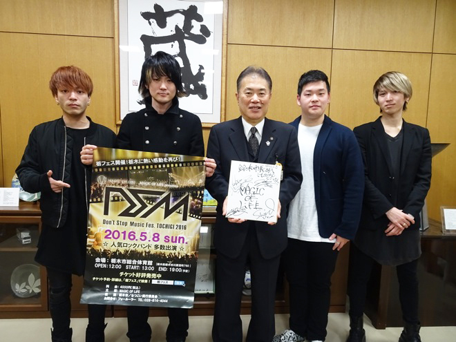 栃木市の後援によって開催される<Don’t Stop Music fes.TOCHIGI 2016>の主催者MAGIC OF LiFEが、その感謝の思いを伝えに栃木市長を表敬訪問したという。