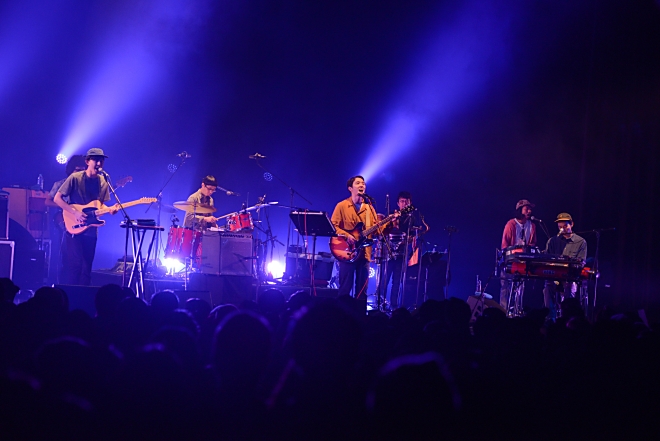 最初に登場したのは、在日ファンク。それだけでもう会場に明るい笑顔が溢れる。浜野謙太(Vo)の「We are 在日ファンク! 新年あけましておめでとう!」という挨拶から「ダンボール肉まん」。そして浜野「在日ファンクのテーマ曲演っていいですか!?」からの「マルマルファンク」、「京都」とどんどん大人の新年会を盛り上げていく。