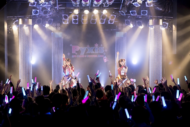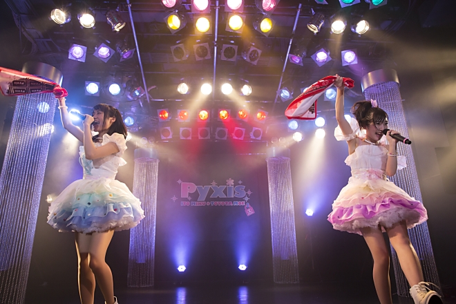 1stライブを迎えられたことへの感謝や今後の意気込みを語った2人は、ラストに待望の新曲を2曲初披露。「Jewel」はPyxisのテーマソングとも言えるキラキラした始まりの楽曲。そして、「トキメキセンセーション」ではみんなで一緒にタオルを回して最高潮の盛り上がりに。Pyxisのこれからの活躍を予感させるようにステージで躍動していた。