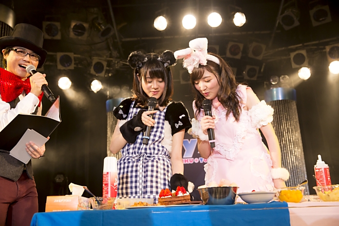 この対決では3つの食材を選んでデコレーションを行ったのだが、中には「納豆」や「焼き鳥」などケーキには到底そぐわないものも。なんとか可愛く飾りつけようとする伊藤とダイナミックな豊田という2人の性格の差も出ていた。対決の後は衣装にちなんだアニメソングを歌い、ここでしか見られない貴重なステージとなった。