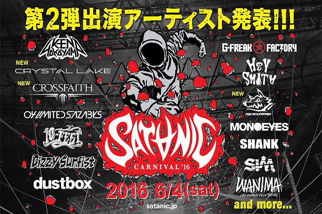 PIZZA OF DEATH主催によるパンク/ラウドロック/ハードコアの祭典<SATANIC CARNIVAL>が、2016年6月4日に幕張メッセ国際展示場9-11ホールで開催される。このたび出演アーティスト第2弾が発表となった。