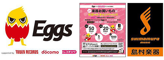 キャンペーンの実施期間は2月17日(水)~ 2016年3月31日(木)。期間中応募者の中から21組に合計225万円の「島村楽器」店頭でお買い物ができる権利をプレゼント。また、期間中、新たに「Eggs」にアーティスト登録した人にはもれなく「サンクス賞」として「島村楽器お買いものクーポン」(1000円引きチケット)をプレゼント。総額275万円超となるキャンペーンだ。