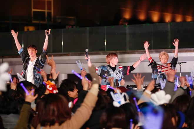 この日の会場は野外ステージ。気温が低く冷たい風が吹くなかメンバーが登場すると、集まった2,000人を超えるファンは大歓声を上げて彼らを迎えた。サウンドチェックの時点で本番さながらの盛り上がりを見せ、eyeronの「寒さもふっ飛ぶようなミニライブにしたいと思います!」という宣言から、1曲目「Good bye 大切な人。」がスタート。ko-daiのヴィブラートが響き、悲しい失恋を歌ったこの曲が持つ切なさを助長させていく。