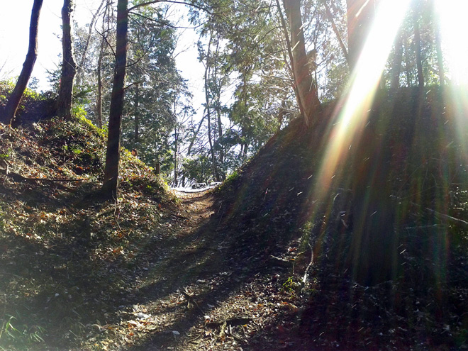 そして左に道が曲がるがここも堀切となっていて、郭2と本郭の間を堀切として、通り道として、両方の役目を果たすようになっている。敵が攻めて来たらこの土塁の上から全方向へ攻撃が出来るシステムになっている。これは本当に素晴らしい。本郭に入るにあたってここで桝形になり門の跡が表れる。この周辺も今でこそ土に埋もれているが発掘調査では両サイド石垣、足元も石畳だったことがわかっている。