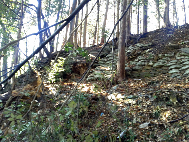 竹田城と同じく、両サイドに羽を広げた山のてっぺんに築城されている小倉城、城の裏は槻川を天然の堀にして防御されている。ひとつはっきりしないのは大手が何処かということである。城の中にはわかるだけで5つの上り口がある。どの道が大手口だったかがわからないのである。