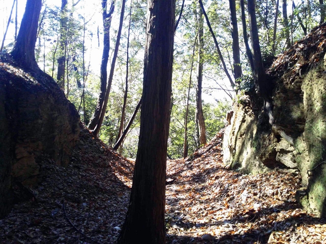 小倉城の魅力をいくつか上げていこう。まずはこの郭4に入り、進んで行くと大堀切に出くわす。現在は土砂が埋もれてきているがここのスケールは素晴らしい。今でこそ土橋で渡るようになっているが当時は絶対に橋が架けられていたとされる。山城の排水溝としての役目も果たしている。ここを渡ると左手の土塁の上が郭2となる。この下にも行ける道があり、たくさんの曲輪が存在する。ここが大手だったと考えても間違いではない。