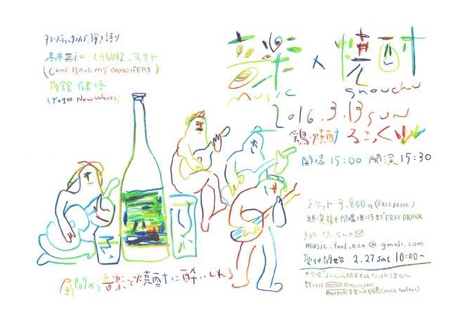 音楽×焼酎と銘打たれたイベントは、「昼間からいつもより飲みすぎて良いライヴ」をコンセプトにアットホームな雰囲気を持つ居酒屋「鶏・焼酎 るこっく」で開催され、本格焼酎を含むドリンクが飲み放題で行われる。