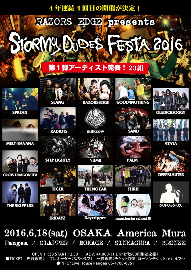 「STORMY DUDES FESTA」は今年で活動20周年を迎える日本を代表するスラッシュハードコアパンクバンドのRAZORS EDGEが、2013年に大阪のライブハウス密集地であるアメリカ村にてスタートさせたサーキットフェスティバルである。本年度2016年で4回目(4年連続)の開催となります。このサーキットフェスの趣旨は、RAZORS EDGEの幅広い活動を活かしたパンク、ハードコアのバンドを軸にジャンルレスなメンツを全国から呼び、とにかく「イケイケ」「どS」なイベントをコンセプトに、会場の熱量が桁違いのフェスティバルを提示したいというものである。RAZORS EDGEがこれまでたくさんのイベントやフェスに出演してきて、自分たちの価値観を軸にまだ世の中に現れてないような面白いイベントができるんじゃないか?っていうのを「じゃ、自分たちで作ってしまおう!」って始めたのがSTORMY DUDES FESTAの始まりのきっかけとなっています。