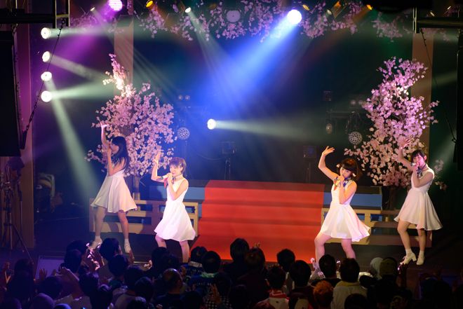 ライブは18:30からスタート。ステージ上のひな壇を使用し、華麗に舞う「OVERTURE」からスタート。1曲目はファーストシングルのカップリング「メグリメグル」。頭の「Everybody! Are you ready for progress? 進化する準備はできてる?」と歌う彼女たちへの歓声はもちろん「OK!」。ファンもすでに一体になった2曲目は「ミーゴゴミーゴ(音源未収録)」。アップなナンバーに早くも会場が揺れはじめる。