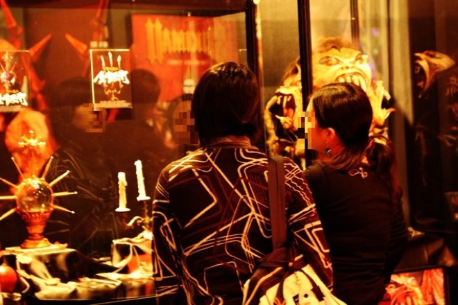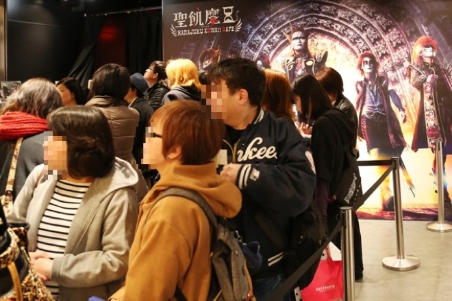 初日となった3月4日(金)には、12:00のオープン前から信者(ファン)による待機列が出来るほど。構成員が描かれたボードを背に記念写真を撮ることが可能なほか、なかなか間近で見ることのできない戦闘服(衣裳)や、過去の教典(アルバムのようなもの)の撮影時に使われた超レアグッズの展示、さらには構成員の歴代写真を絵柄にした“缶バッジ”のガチャが展開されるなど、そこに広がる“聖飢魔IIワールド”に信者たちが狂喜乱舞した。世代を超えて新たな信者が増殖中の聖飢魔IIは、原宿の“KAWAii”文化を“KOWAii”文化に塗り替えてしまうに違いないだろう。