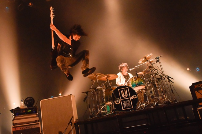 先攻はUNISON SQUARE GARDEN。鈴木貴雄(Dr)、田淵智也(B)、斎藤宏介(Vo&G)の順にステージへ登場。いつものオープニングSEであるイズミカワソラの「絵の具」のピアノサウンドを「天国と地獄」の重厚なイントロが突き破り、ライヴをスタートさせた。獰猛な動物のように暴れまわる3人の音に煽られるようにして、超満員のSTUDIO COASTのフロアも一気に最高潮へ。続いて「シュガーソングとビターステップ」を畳み掛け、久々に披露された2ndアルバム『JET CO.』収録の「ライドオンタイム」では、田淵がベースを持ちながら縦横無尽に動き回る。