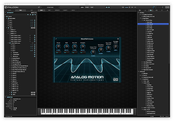 80年代のシンセポップやクラシックフィルムスコアの印象的なサウンドというコンセプトによって生まれた「Analog Motion」は、「Falcon」ユーザーに幅広い種類の音色パッチを提供する。シングルキーのサウンドスケープ、アルペジオシーケンス、伝統的なポリフォニックシンセサウンド、リズミックテクスチャーなどさまざまなサウンドをプリセットとして用意。111のアナログシンセスタイルの音色パッチが収録されている。