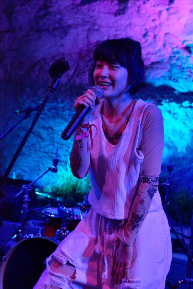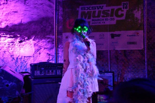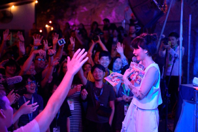 そして3月15日22:00に「Cheer Up Charlie’s」で本番がスタート。「ナポレオン」がはじまるとステージ後方のライブ会場入口から、お神輿に乗ってコムアイが登場し、会場に歓声が沸き起こった。続いて「ユタ」を歌いあげると、ここでコムアイから英語で「みんな、ありがとう。今、東京でアルバムをつくっているの。次のアルバムは6月にワーナーミュージック(Atlantic)からリリースします。」とメジャーリリースの決定が発表され、アルバムに収録予定の新曲「チュパカブラ」をライブ初披露した。
