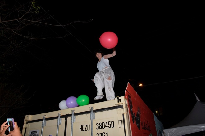 また、「メデューサ」では、ライトを持って観客の間を動き回り、そのまま客席後方のコンテナに登り「シャクシャイン」を披露、そして「桃太郎」では、先日行われた東京・大阪のワンマンライブでも披露したウォーターボールに入って観客の頭上をクラウドするパフォーマンスをおこなった。