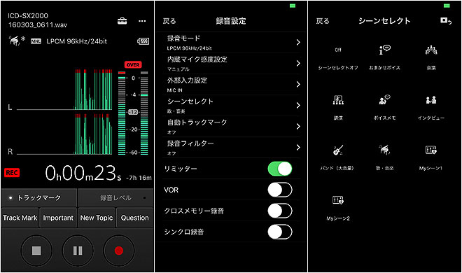 ぜひ使いこなしたいのが、録音モードやマイク感度などの項目を一括でオススメの設定に切り替えられる「シーンセレクト」。「おまかせボイス」「会議」「講演」「ボイスメモ」「インタビュー」「歌・音楽」「バンド(大音量)」に加え、ユーザーが設定を記録できる「Myシーン1」、「Myシーン2」をプリセット。まずはシチュエーションに合ったシーンを選んでおいて、録音モードのみMP3から96kHz/24bitに変えるといった、一部項目だけを変更する使い方も可能。気に入った設定の組み合わせをMyシーンに登録すれば、いつでもその設定を一発で再現、すぐに録音を開始することができる。