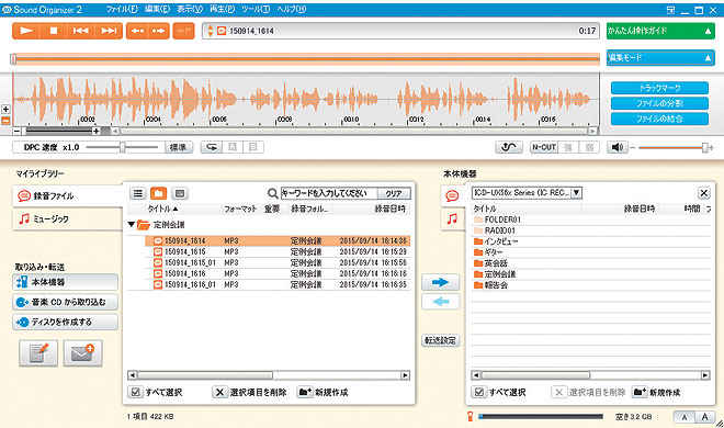 ▲「Sound Organizer 2」は、録音したデータをカンタンに編集・再生・管理できるソフトウェア。会議の議事録作成、語学学習、音楽再生などをサポート、CD作成も行える。