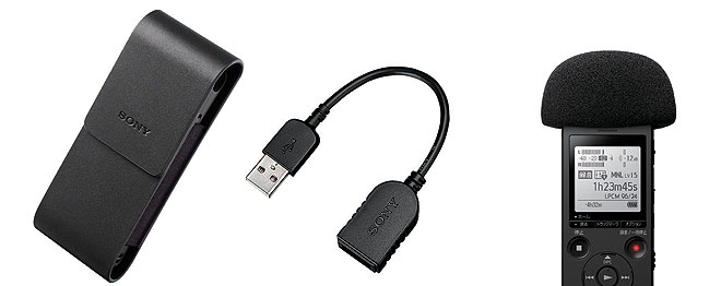 ▲付属品は左からキャリングケース、USB接続補助ケーブル、ウィンドスクリーン。補助ケーブルは本体を直接機器に接続できない場合に使用する、メス端子付きのケーブルだ。