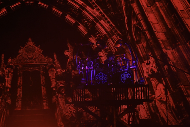 30分押しで始まったステージは、メッセージ性の強い映像と教義を思わす音像が支配するエキセントリックなオープニングで、オーディエンスを【漆黒】の世界へと誘った。
