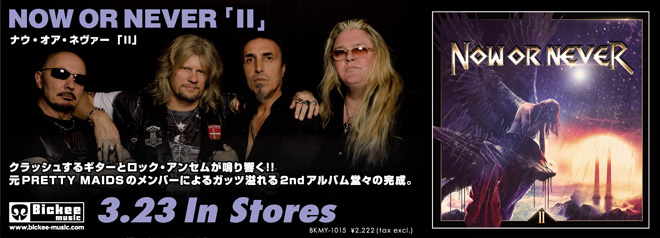 ナウ・オア・ネヴァーは、2012年にギターのリッキー・マークス(exプリティ・メイズ)によって結成され、ドラマーのランゾ、シンガーのジョー(ex NIGHTMARE)、ベースのケン(exプリティ・メイズ)で活動を開始、デビュー・アルバム『Now Or Never』を2014年初頭に発表しプレスとメタルヘッズから好評価を得たバンドだ。2015年秋に、デビュー作のプロデュースを担当したパット・リオタードを再び迎えてレコーディングを開始、この最新作『II』を完成させた。