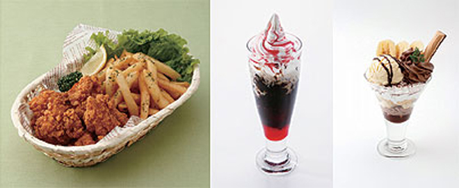 ▲オススメメニューのチキンバスケット、ミルゼリッチストロベリー、ミニチョコパフェ。