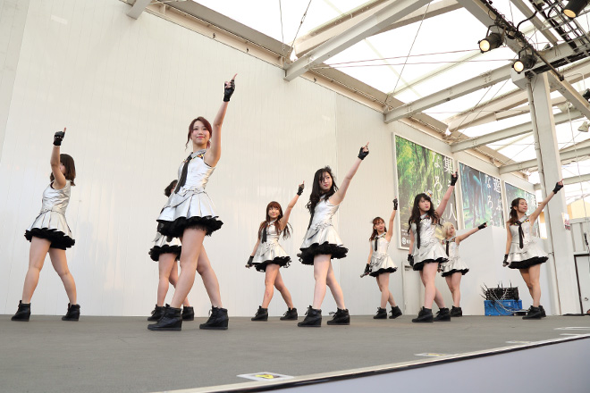 この日のイベント(第2部)は、山本真凜の歌声が青空へと心地よく溶けていく「Challenger」からスタート。拳を突き上げて未来へのチャレンジを誓う9人の姿に集まったファンから歓声が飛ぶ。さらに結成4周年記念ライブで初解禁された、6月リリースのアルバム収録曲「Hungry」を披露。これまた気持ちいいアッパーチューンと全員参加の“ハイタッチ”の振りで、ライブやイベントで映える1曲だ。