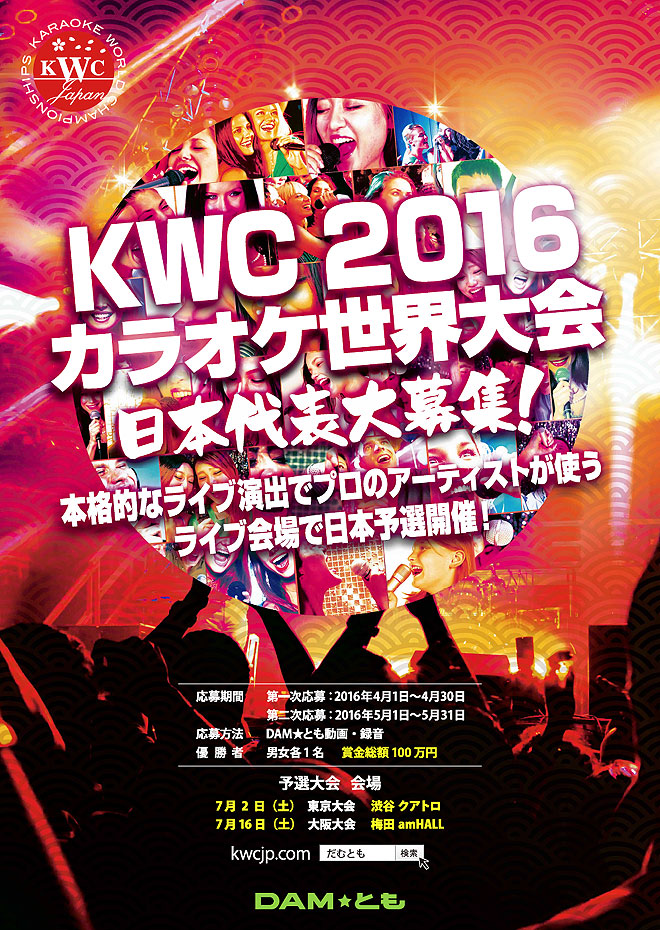今年も世界中で盛り上がること必至のKWC。参加条件は「18歳以上のアマチュア」と非常にシンプル。DAM★ともで応募するだけというエントリーの手軽さも見逃せない。応募方法など詳細は4月1日から下記のKWCオフィシャルサイトで確認できる。カラオケ世界チャンピオンを目指すアマチュアシンガーはもちろん、ちょっと興味があるという人も、まずはエントリーを!