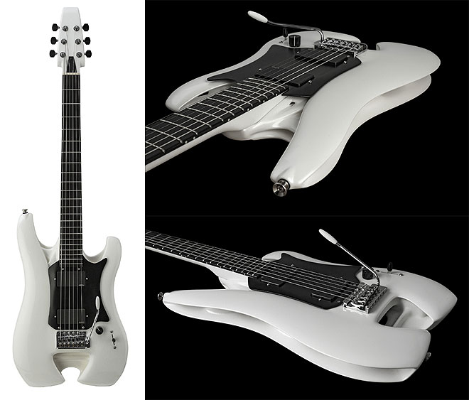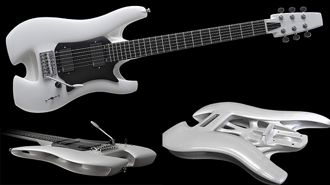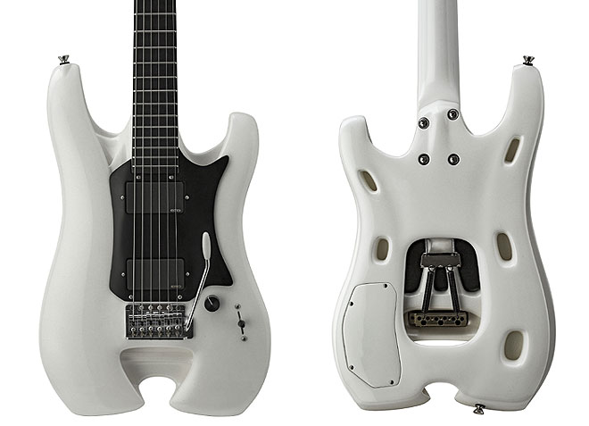 複雑で有機的な形状を持つボディに採用されたのは「ナイロン12」という樹脂。合成と靭性に優れ、適度な内部損失により、エレクトリックギターとして良好な音響特性を持つという。比重は一般的な木材の約2倍。余分な肉を削ぎ落としたコンパクトかつエレガントなフォルムにより体にぴったりフィット。内蔵に配されたトラスがお互いに連結・補強し合って応力を分散し、バランスを保つ構造となっている。同時にこのトラスは音響伝達の役割も果たし、全体をスムーズに振動させ、低音から高音までバランスよく鳴るようデザインされている。