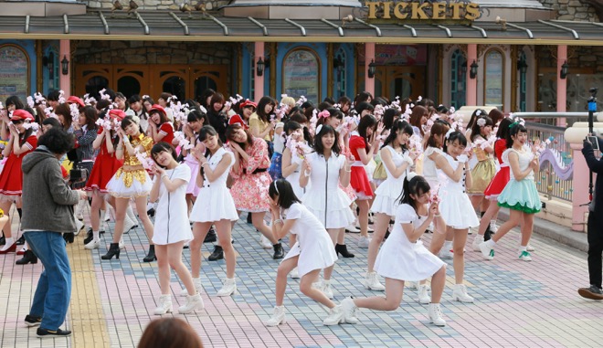 そこで、季節にマッチした楽曲「桜ナイトフィーバー」を、こぶしファクトリーのメンバーと各地のユニドルが一緒に踊る企画が立ち上がった。名付けて“桜前線北上プロジェクト”。福岡から始まり、関西、名古屋、東京、仙台、北海道をメンバーが訪問。この模様を桜前線が北上するように次々と公開していく。東京では、3月27日にサンリオピューロランドで開催されたユニドルの<卒コン>の前に撮影が行なわれ、完結編として100人近くのユニドルと一緒に踊ることができた。