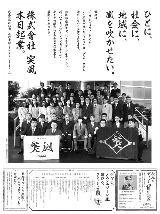 株式会社 突風は企業理念として、「T.M.Revolutionを商材とした新たなビジネスモデルを提案する企業です。“T.M.R.”をきっかけに、社会に、地域に、より多くのひとりひとりに、「いい風」が吹くことを目指しています」というものを掲げている。その事業内容として、“T.M.Revolutionデビュー20周年事業の推進”に加え、“地域活性化施策事業など”が今後展開されるはずだ。
