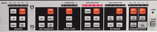 ▲フロントパネルのボタンは、左からMASTER、MIC MODELER、AUTO-TUNE、COPRESSOR/GATE、DE-ESSER、EQUALIZER/OUTPUTと機能ごとにセクション分けされている。名称からもわかるとおり、ピッチ補正だけでなく、ボーカルレコーディングに有用な機能が豊富に用意されているのだ。