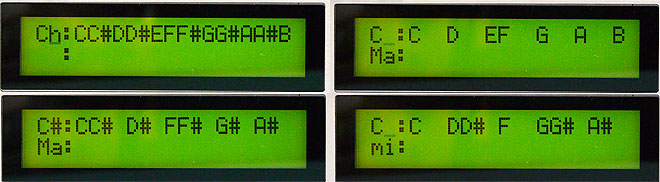 ▲スケール設定の例。上段左がクロマチック、右がCメジャー。下段はC#メジャーとCマイナー。使用する音を1つ1つ選択することもできる。