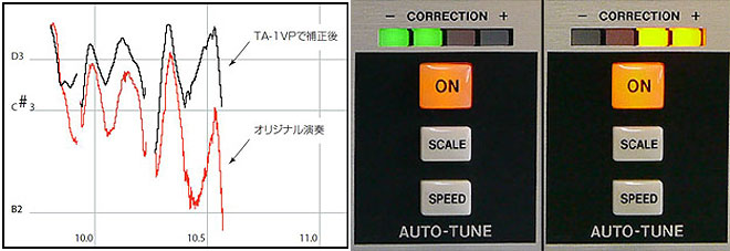 ▲左の図はピッチ補正の概念図(TASCAMの製品ページより)。ピッチ補正が働くと本体のインジケーターが左右に触れる(写真)。オリジナルの演奏の音が低い場合は緑(左)に、高い場合はオレンジ(右)に。