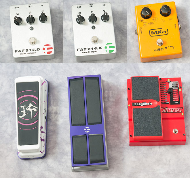 上段左から、FAT514.D(ブースター)、FAT214.K(コンプレッサー)、MXRフェイズ100。下段左から、ジムダンロップ製TM95 / TAK CRY BABY、FATがカスタマイズしたBOSS製ボリュームペダルFV-500L、デジテックのワーミー。CRY BABYは「Vermillion Palace」「Ups and Downs」「Dream Drive」「#1090 ~Million Dreams~」で使用。FAT514.Dは「Mystic Journey」を除く全曲で使用。FAT214.Kは「Vermillion Palace」「Step to Heaven」「Ups and Downs」「Rock The Rock」を除く全曲で使用。フェイズ100は「The Rock Show」で使用。ワーミーは「Rock The Rock」で使用している。