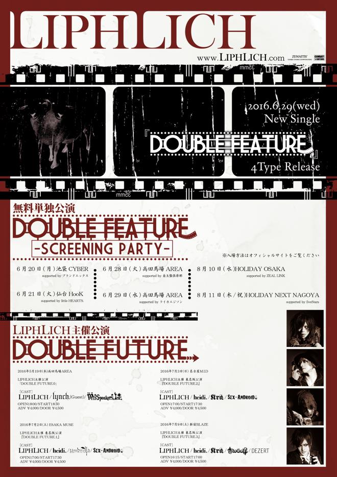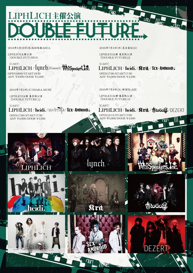 また、5月からはlynch.、Mix Speaker’s,Inc.、heidi.、umbrella、SEX-ANDROID、Kra、NoGoD、DEZERTを招き、<LIPHLICH主催 東名阪公演『DOUBLE FUTURE』>と題したイベントの開催が決定。こちらは全4公演となっており、ファイナルは東京・新宿BLAZEにて行なわれる。さらに6月から8月にかけて、東名阪仙にて<無料単独公演「DOUBLE FEATURE-SCREENING PARTY-」>(全6公演)を実施することも発表されている。