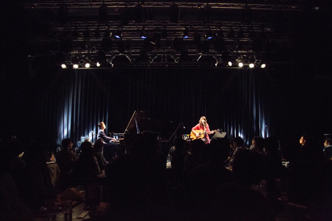 「女の子しばりの選曲でお届けしている2部の公演ですが、“Live of Lazward Piano”というのはですね、私がアコギを弾き、ピアノ西村広文さんと二人編成で行うライブのことです。次に歌う曲は、東京でぽっかり空いた一日があって、私の中で曲を作りたいという気持ちが湧いてきまして。西村さんと一緒にスタジオに入って作った曲です。裏テーマとしては……私の曲で“幸せな曲”ってないんですよ(笑)。結婚式でも歌える曲があったらいいなと思って作った曲でもあります。では、楽しく聴いてもらいたいので、良かったら軽めに手拍子を、大きめでも大丈夫ですので、手拍子をください(笑)」──植田真梨恵