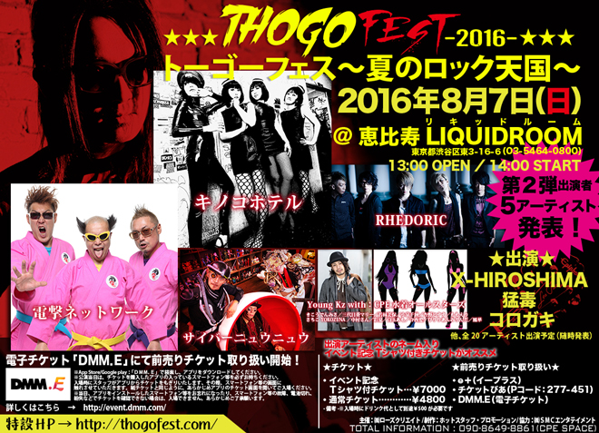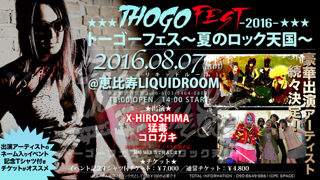 大仁田厚バンドや、ドラゴンボール芸人ぴっかり高木率いる「コロガキ」のギターTHOGO(トーゴー)が、この夏、恵比寿のリキッドルームで仕掛ける一大イベント『トーゴーフェス~夏のロック天国~』の第2弾出演者が発表になった。