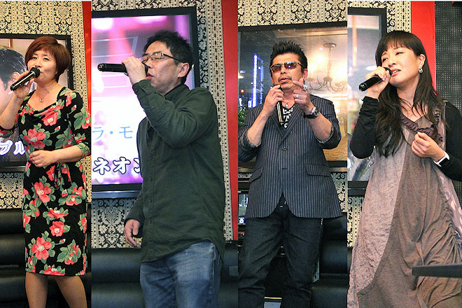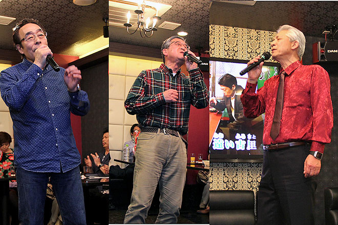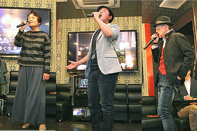 そんなシステムの説明もそこそこに、さっそく歌唱タイムがスタート。まずはチロリアンハットをダンディにキメた男性から。トップバッターということもあって多少緊張ぎみの面持ち。“手が震える”とも言っていたが、メリハリも効かせて軽快に「望郷屋台酒」を歌い上げた。続いて福島から来たという、これまたハットでキメた男性。大人っぽく見えたがなんと14歳ということで、驚きの声とあたたかい拍手に包まれた。そして「博多ア・ラ・モード」を歌い始めると、その上手さに一同またビックリ。情感こもってムードいっぱい、タメも効いていてコブシもよく回る。声もいい。10代の若者とは思えない完成度の歌唱力に、会場から大きな歓声と拍手が送られた。