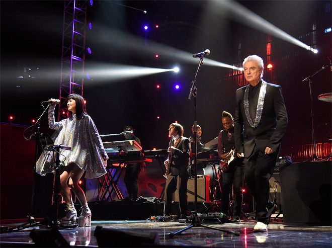 #DavidByrne + @kimbramusic + @theroots kicking off #RockHall2016 w/@DavidBowieReal’s “Fame!!” pic.twitter.com/0GaKCdXxBA
