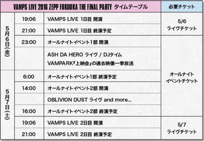 VAMPSが2016年5月6日および7日の2日間、閉館が決定しているZEPP FUKUOKAでファイナルパーティーを開催することは既報のとおり。本日13日18時より、そのチケット先行受付がスタートした。
