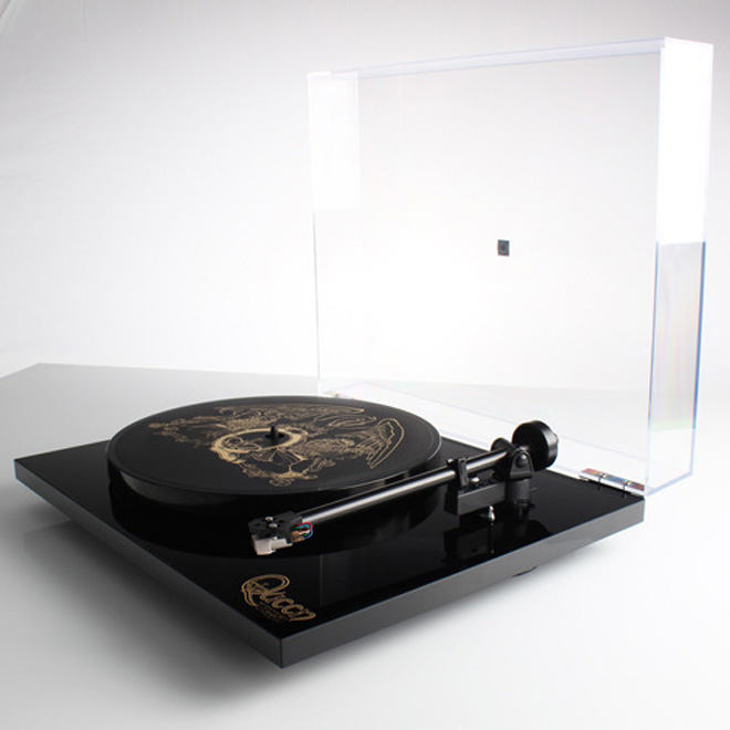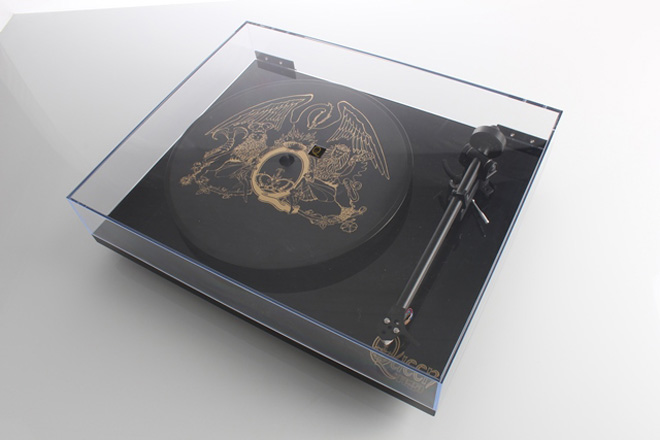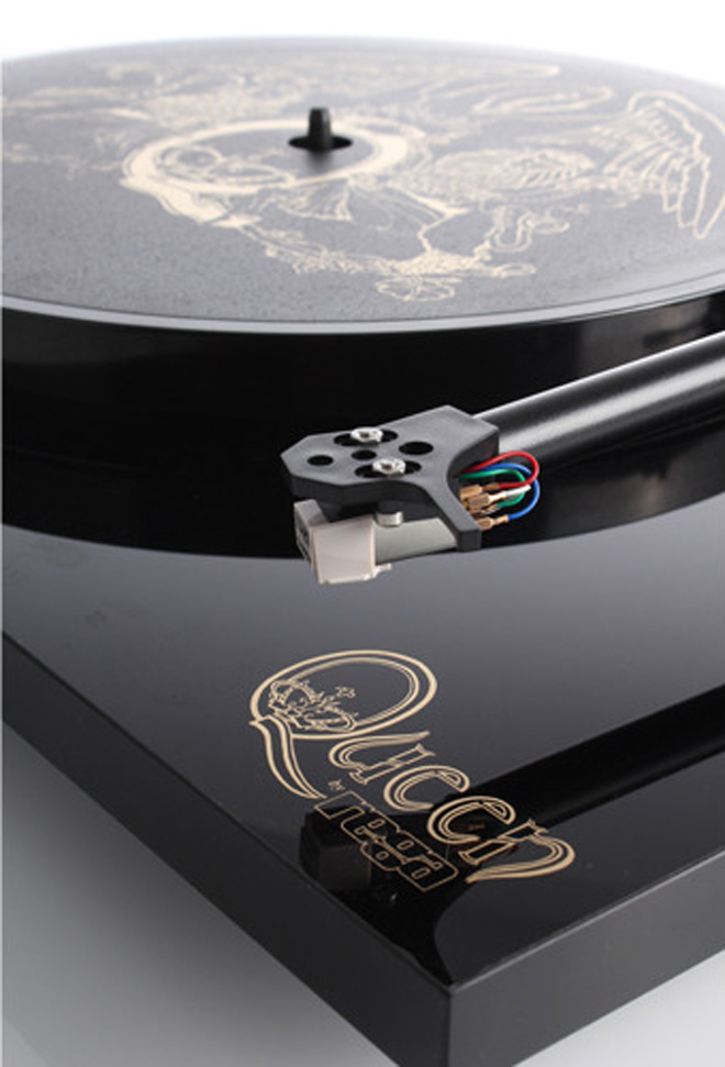 このプレイヤーは、2015年にクイーン結成40周年を記念して全世界で限定販売が開始されたもので、英国のオーディオ・ブランド、レガ(rega)社のオリジナル・アナログ・プレーヤーのクイーン・モデルとなる。クイーンのアート・ディレクター、リチャード・グレー監修のもと、レコードを載せるターンテーブルにはフレディ・マーキュリーが描いたエンブレムがデザインされ、その印刷の品質も厳しく管理されたものだ。ダスト・カバーにもクイーンのロゴが使用され、高級感あふれるモデルに仕上がっている。