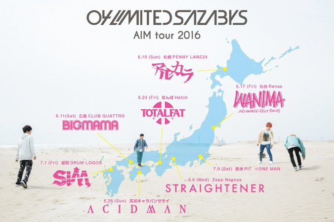 地元名古屋での初の主催野外フェス「YON FES 2016」を開催し、更にスケールアップした名古屋の4人組ロックバンド04 Limited Sazabys。彼らが全国8か所にておこなう今回の<04 Limited Sazabys「AIM tour 2016」>は、ストレイテナー、BIGMAMA、WANIMA、アルカラ、TOTALFAT、ACIDMAN、SiMといった強力なバンドが招かれる。そしてファイナルは、バンド史上最大キャパとなる豊洲PITでのワンマン。チケットは、各プレイガイドにて発売されるので、早めのチェックして欲しい。
