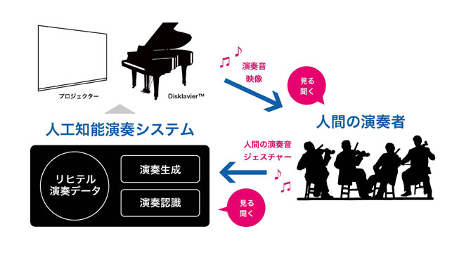 ヤマハの「演奏性追従技術」にも注目。アンサンブルの共演者である人間が演奏する「音」と「ジェスチャー」を逐次理解し、次の瞬間の演奏を予測することで、人間と協調した自動演奏を行う。