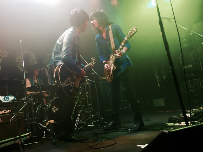 本番30分程前。1階の楽屋で、なべちゃんは黙々とグレッチ社特製のパッドをしばいている。姐さんは集中して化粧をしている。それはバンドにとっていつもの景色だし、それぞれ本番前の気持ちを作り上げる儀式をしているみたいにも見える。